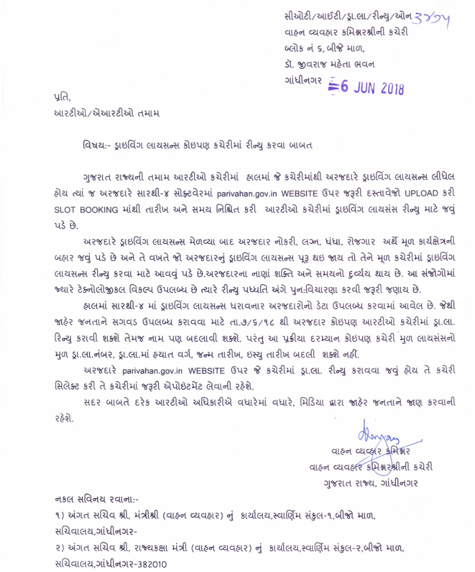 HAVE KOI PAN RTO KACHERI MANTHI DRIVING LICENSE RENEW KARAVI SAKASHE TE BABAT MAHTVAPURN PARIPATRA DATE-6-6-2018.